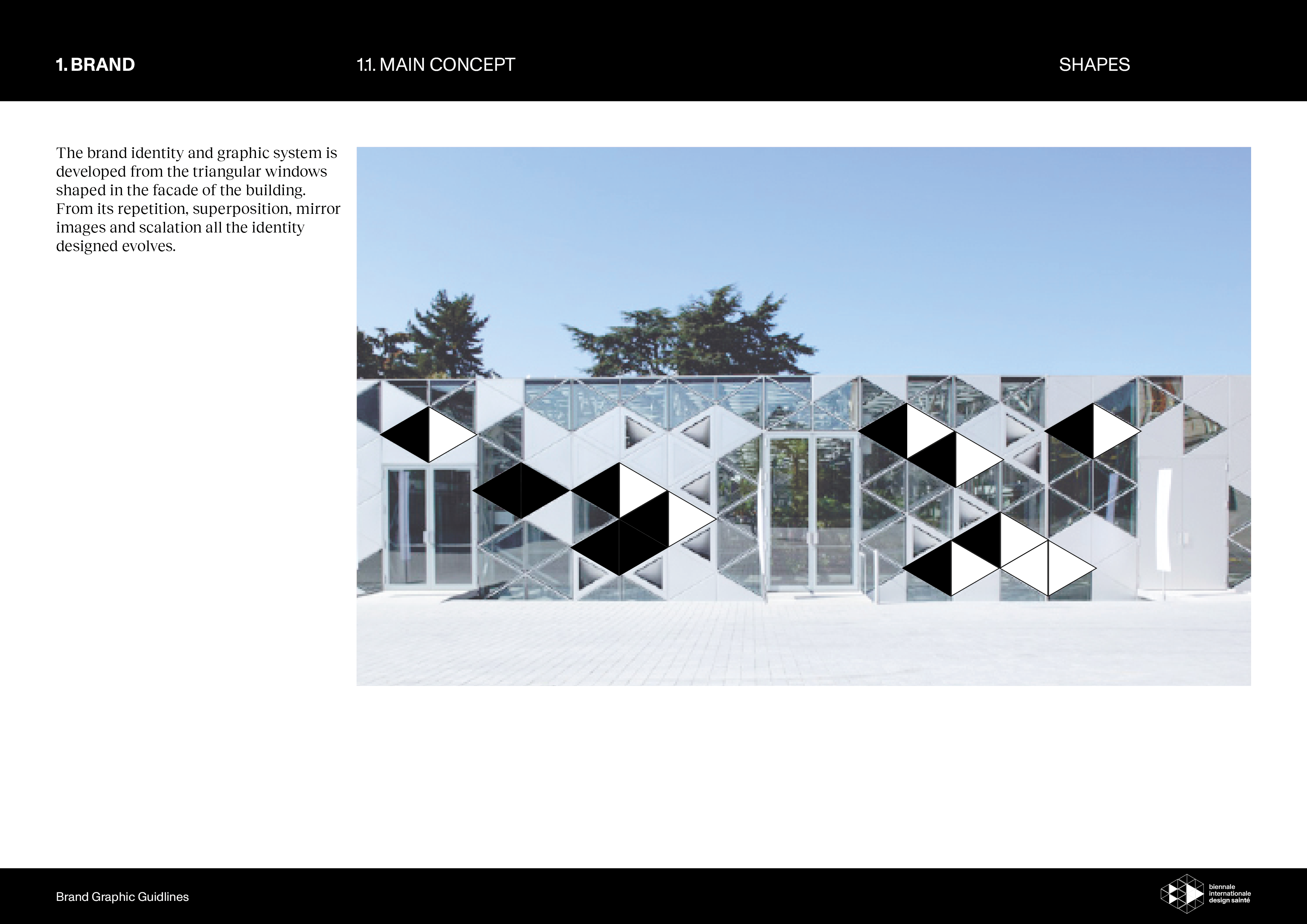 The graphic system is designed to complement the architecture of the venue where the media event takes place. Semi-abstract triangular shapes and their consistent repetition serve as a strong visual resolution. The generative branding for the exhibition reflects the duality between the artists' perspectives on their work and their relationship with the audience. This visual approach captures two contrasting viewpoints that coexist simultaneously, aligning with the concept of iterative design.